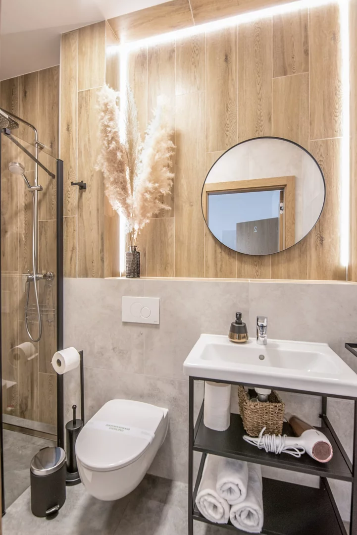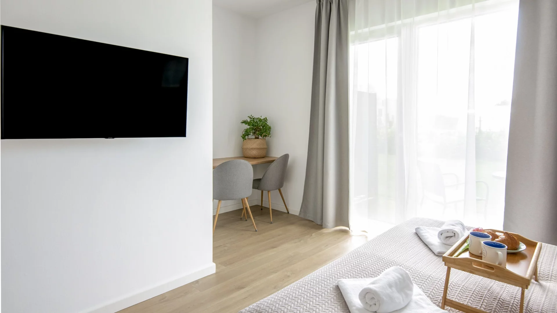 Odpocznij w naszych dużych, jasnych apartamentach, łączących komfort domowego wnętrza z nadmorskim klimatem. Każdy pokój oferuje wygodne łóżka, miejsce do pracy z dostępem do Wi‑Fi, prywatny , duży taras na poranną kawę oraz przestronną łazienkę z ręcznikami i suszarką do włosów. Do Twojej dyspozycji jest także minilodówka na napoje i przekąski.